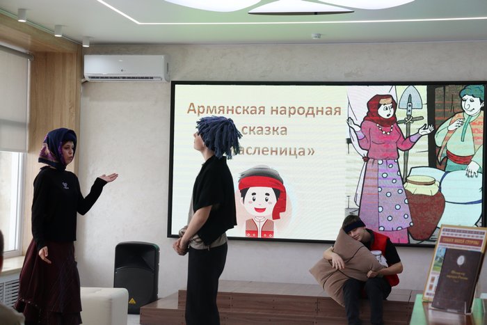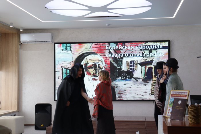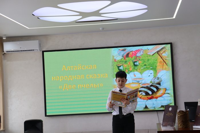 Знакомство со сборником сказок народов Алтайского края «Сказки нашей стороны» началось с аудиопрослушивания сказки «Две пчелы» на алтайском языке, а продолжилось чтением в русском переводе. Все вместе смотрели инсценировки еврейской народной «Сказки о двух грошах» и армянской народной сказки «Масленица» в исполнении участников театральной студии «Ступенька».