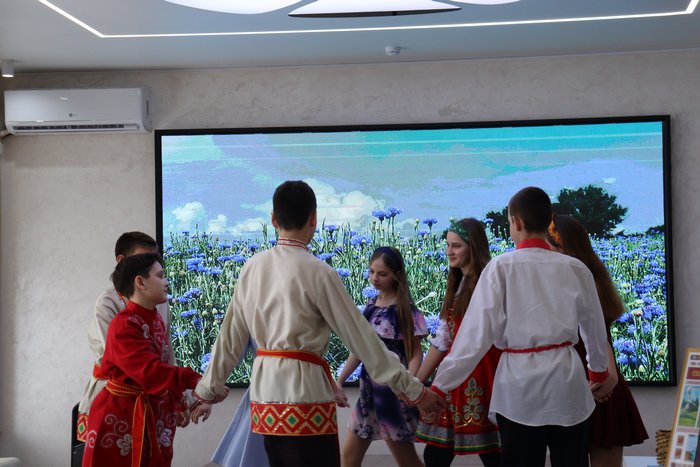 Музыкальное оживление в программу внес танец «Василёк», представленный учениками 7 «а» класса Веселоярской СОШ. Танец плавно перешел в народную игру «Ручеек», объединившую гостей всех возрастов. Кульминацией встречи стало перевоплощение зрителей в мастеров. Каждый участник мероприятия выполнил творческое задание – вырезал фигурки людей в национальной одежде. Затем подбирали пару по национальности, рассматривали получившуюся единую композицию – символ дружной семьи народов нашей страны.