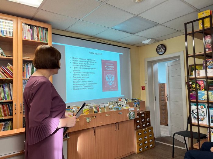 В начале мероприятия ребята посмотрели видео «Как принимаются законы в РФ». Затем библиотекарь познакомила их с документами, согласно которым россияне, в том числе и школьники, имеют права и обязанности.