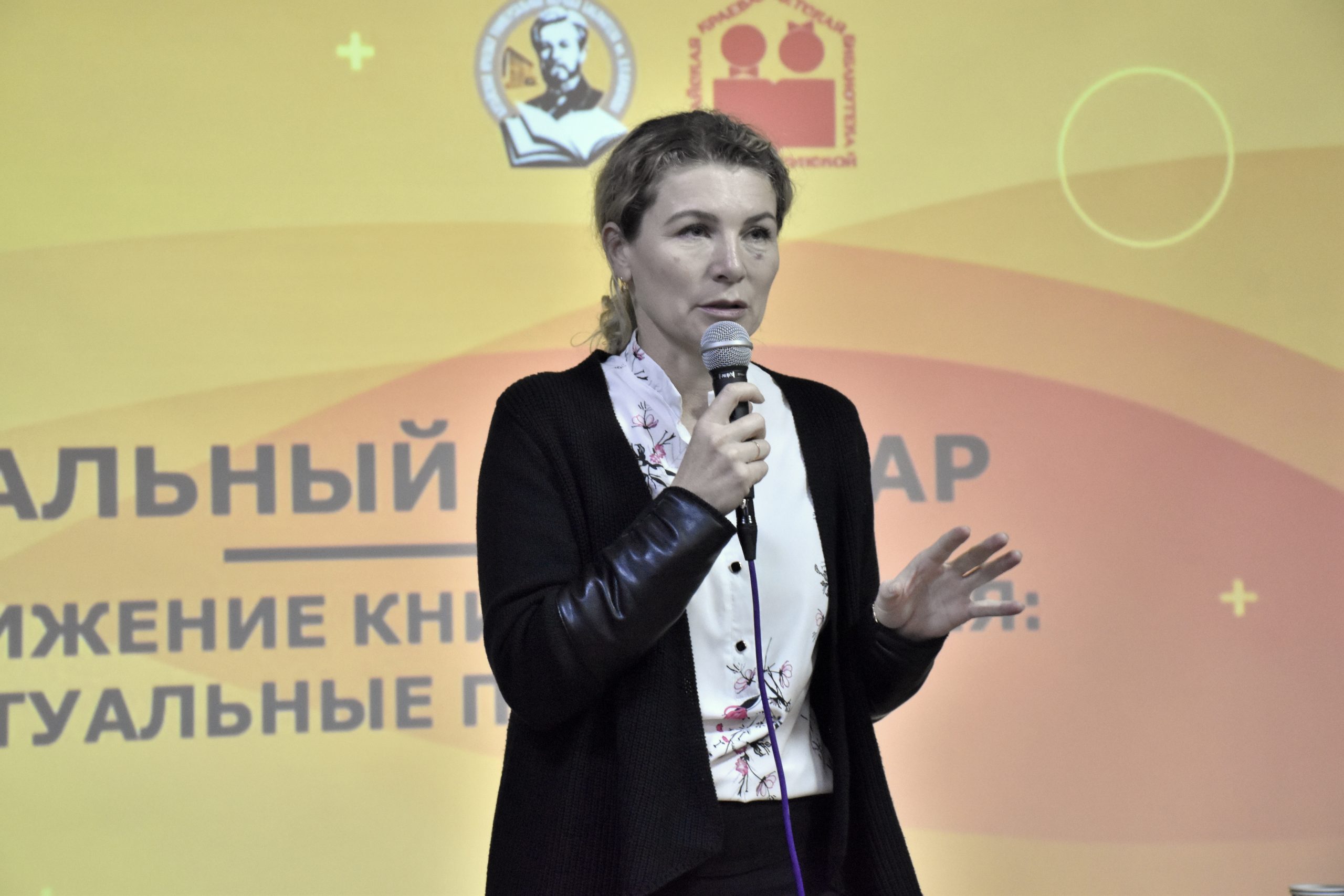 О специфике работы с детской аудиторией рассказала Лариса Михайловна Чудинова, главный библиотекарь методического отдела КГБУ АКДБ, осветив современные подходы и идеи в продвижении детского чтения.